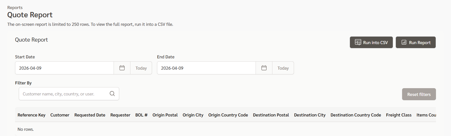 You can access the same report directly from the Reports section. Go to Reports and select Quotes Report. From here, you can choose a start and end date, filter by customer, city, country, or user, and run the report on screen or export it to CSV. The on-screen report shows up to 250 rows, so use Run into CSV if you need the full report.